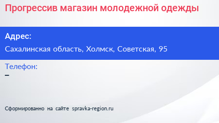Прогрессив, магазин молодежной одежды по адресу Сахалинская область, Холмск, Советская, 95 в дальнейшем Организация, размещена в следующих категориях: