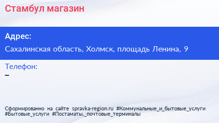 Стамбул, магазин по адресу Сахалинская область, Холмск, площадь Ленина, 9 в дальнейшем Организация, размещена в следующих категориях:
