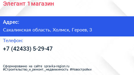 Элегант-1, магазин по адресу Сахалинская область, Холмск, Героев, 3 в дальнейшем Организация, размещена в следующих категориях: