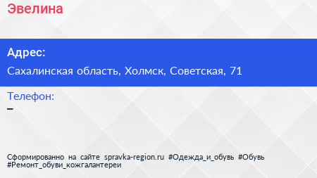 Эвелина по адресу Сахалинская область, Холмск, Советская, 71 в дальнейшем Организация, размещена в следующих категориях: