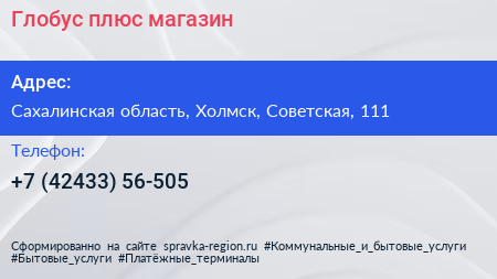 Глобус плюс, магазин по адресу Сахалинская область, Холмск, Советская, 111 в дальнейшем Организация, размещена в следующих категориях: