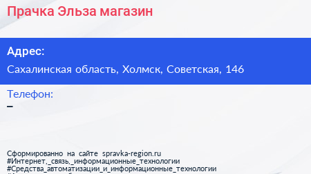 Прачка Эльза, магазин по адресу Сахалинская область, Холмск, Советская, 146 в дальнейшем Организация, размещена в следующих категориях: