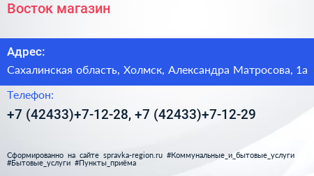 Восток, магазин по адресу Сахалинская область, Холмск, Александра Матросова, 1а в дальнейшем Организация, размещена в следующих категориях: