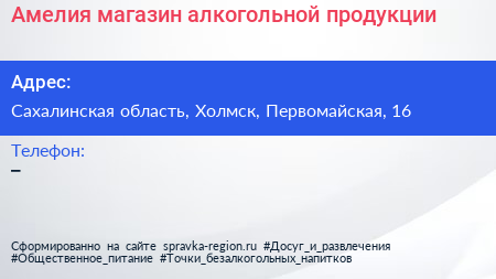 Амелия, магазин алкогольной продукции по адресу Сахалинская область, Холмск, Первомайская, 16 в дальнейшем Организация, размещена в следующих категориях: