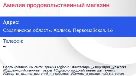 Амелия, продовольственный магазин по адресу Сахалинская область, Холмск, Первомайская, 16 в дальнейшем Организация, размещена в следующих категориях: