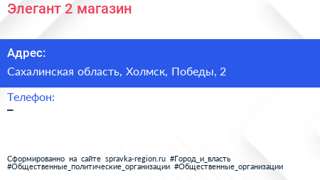 Элегант-2, магазин по адресу Сахалинская область, Холмск, Победы, 2 в дальнейшем Организация, размещена в следующих категориях: