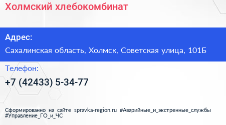 Холмский хлебокомбинат по адресу Сахалинская область, Холмск, Советская улица, 101Б в дальнейшем Организация, размещена в следующих категориях: