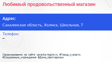 Любимый, продовольственный магазин по адресу Сахалинская область, Холмск, Школьная, 7 в дальнейшем Организация, размещена в следующих категориях: