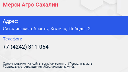 Мерси Агро Сахалин по адресу Сахалинская область, Холмск, Победы, 2 в дальнейшем Организация, размещена в следующих категориях: