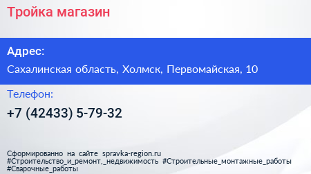 Тройка, магазин по адресу Сахалинская область, Холмск, Первомайская, 10 в дальнейшем Организация, размещена в следующих категориях: