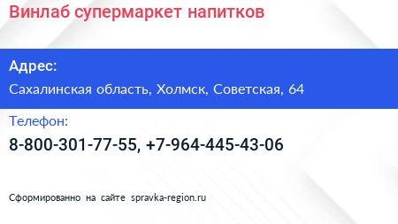 Винлаб, супермаркет напитков по адресу Сахалинская область, Холмск, Советская, 64 в дальнейшем Организация, размещена в следующих категориях: