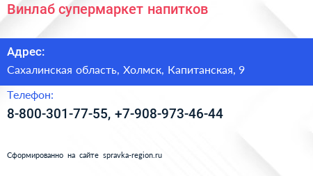 Винлаб, супермаркет напитков по адресу Сахалинская область, Холмск, Капитанская, 9 в дальнейшем Организация, размещена в следующих категориях: