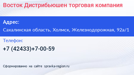 Восток-Дистрибьюшен, торговая компания по адресу Сахалинская область, Холмск, Железнодорожная, 92а/1 в дальнейшем Организация, размещена в следующих категориях: