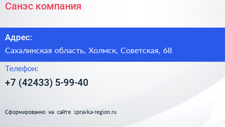 Санэс, компания по адресу Сахалинская область, Холмск, Советская, 68 в дальнейшем Организация, размещена в следующих категориях: