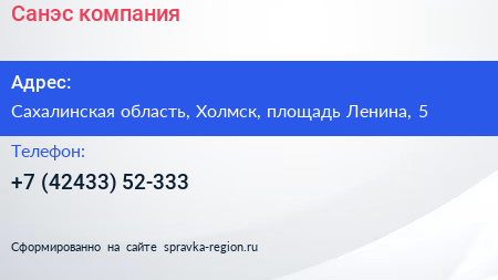 Санэс, компания по адресу Сахалинская область, Холмск, площадь Ленина, 5 в дальнейшем Организация, размещена в следующих категориях: