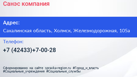 Санэс, компания по адресу Сахалинская область, Холмск, Железнодорожная, 105а в дальнейшем Организация, размещена в следующих категориях: