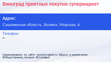 Виноград приятных покупок, супермаркет по адресу Сахалинская область, Холмск, Морская, 6 в дальнейшем Организация, размещена в следующих категориях: