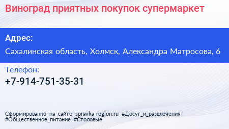 Виноград приятных покупок, супермаркет по адресу Сахалинская область, Холмск, Александра Матросова, 6 в дальнейшем Организация, размещена в следующих категориях: