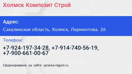 Холмск Композит Строй по адресу Сахалинская область, Холмск, Лермонтова, 26 в дальнейшем Организация, размещена в следующих категориях: