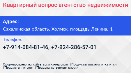 Квартирный вопрос, агентство недвижимости по адресу Сахалинская область, Холмск, площадь Ленина, 1 в дальнейшем Организация, размещена в следующих категориях: