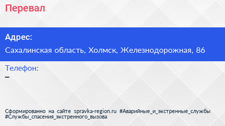 Перевал по адресу Сахалинская область, Холмск, Железнодорожная, 86 в дальнейшем Организация, размещена в следующих категориях: