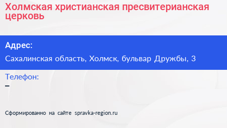 Холмская христианская пресвитерианская церковь по адресу Сахалинская область, Холмск, бульвар Дружбы, 3 в дальнейшем Организация, размещена в следующих категориях: