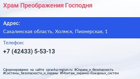 Храм Преображения Господня по адресу Сахалинская область, Холмск, Пионерская, 1 в дальнейшем Организация, размещена в следующих категориях: