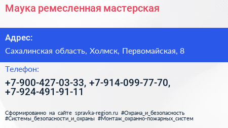 Маука, ремесленная мастерская по адресу Сахалинская область, Холмск, Первомайская, 8 в дальнейшем Организация, размещена в следующих категориях: