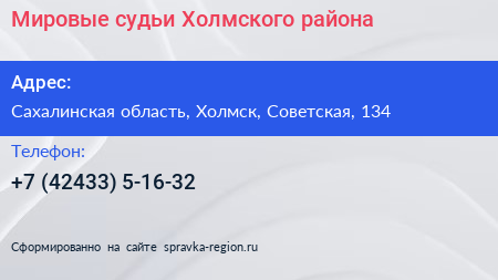 Мировые судьи Холмского района по адресу Сахалинская область, Холмск, Советская, 134 в дальнейшем Организация, размещена в следующих категориях: