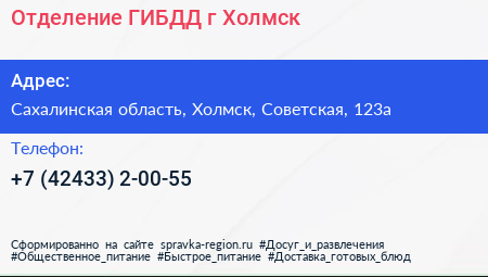 Отделение ГИБДД, г. Холмск по адресу Сахалинская область, Холмск, Советская, 123а в дальнейшем Организация, размещена в следующих категориях: