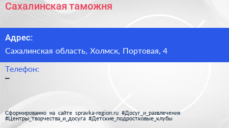 Сахалинская таможня по адресу Сахалинская область, Холмск, Портовая, 4 в дальнейшем Организация, размещена в следующих категориях: