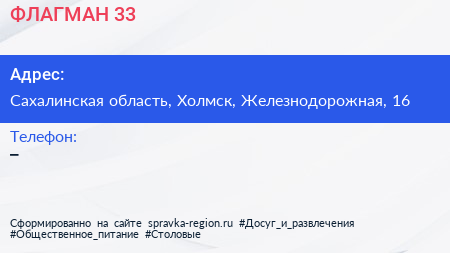 ФЛАГМАН №33 по адресу Сахалинская область, Холмск, Железнодорожная, 16 в дальнейшем Организация, размещена в следующих категориях:
