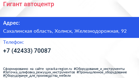 Гигант, автоцентр по адресу Сахалинская область, Холмск, Железнодорожная, 92 в дальнейшем Организация, размещена в следующих категориях: