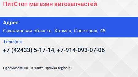 ПитСтоп, магазин автозапчастей по адресу Сахалинская область, Холмск, Советская, 48 в дальнейшем Организация, размещена в следующих категориях:
