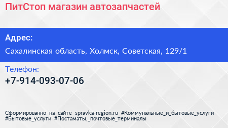 ПитСтоп, магазин автозапчастей по адресу Сахалинская область, Холмск, Советская, 129/1 в дальнейшем Организация, размещена в следующих категориях: