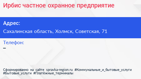 Ирбис, частное охранное предприятие по адресу Сахалинская область, Холмск, Советская, 71 в дальнейшем Организация, размещена в следующих категориях: