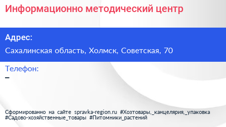 Информационно-методический центр по адресу Сахалинская область, Холмск, Советская, 70 в дальнейшем Организация, размещена в следующих категориях: