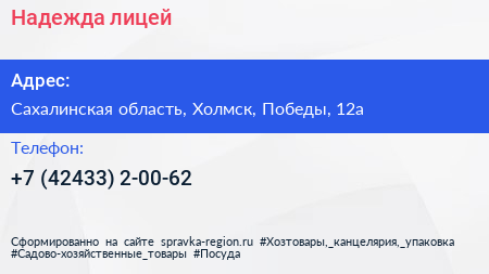 Надежда, лицей по адресу Сахалинская область, Холмск, Победы, 12а в дальнейшем Организация, размещена в следующих категориях: