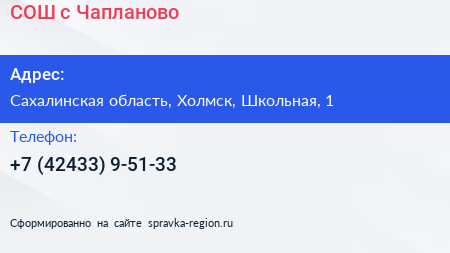 СОШ с. Чапланово по адресу Сахалинская область, Холмск, Школьная, 1 в дальнейшем Организация, размещена в следующих категориях:
