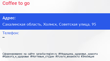 Coffee to go по адресу Сахалинская область, Холмск, Советская улица, 95 в дальнейшем Организация, размещена в следующих категориях: