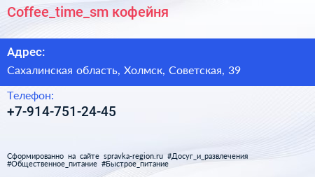 Coffee_time_sm, кофейня по адресу Сахалинская область, Холмск, Советская, 39 в дальнейшем Организация, размещена в следующих категориях: