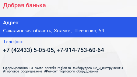 Добрая банька по адресу Сахалинская область, Холмск, Шевченко, 54 в дальнейшем Организация, размещена в следующих категориях: