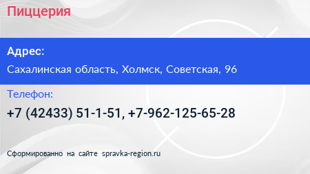 Пиццерия по адресу Сахалинская область, Холмск, Советская, 96 в дальнейшем Организация, размещена в следующих категориях: