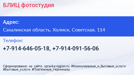 БЛИЦ, фотостудия по адресу Сахалинская область, Холмск, Советская, 114 в дальнейшем Организация, размещена в следующих категориях: