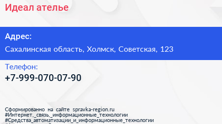 Идеал, ателье по адресу Сахалинская область, Холмск, Советская, 123 в дальнейшем Организация, размещена в следующих категориях: