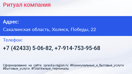 Ритуал, компания по адресу Сахалинская область, Холмск, Победы, 22 в дальнейшем Организация, размещена в следующих категориях: