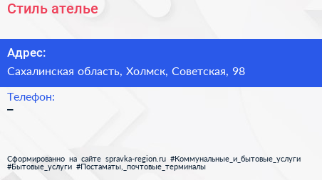 Стиль, ателье по адресу Сахалинская область, Холмск, Советская, 98 в дальнейшем Организация, размещена в следующих категориях: