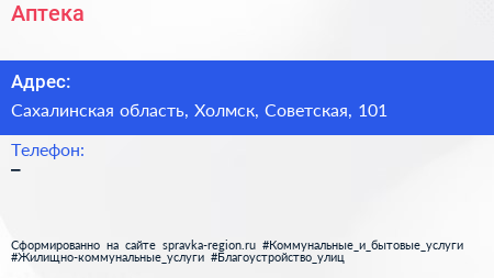 Аптека по адресу Сахалинская область, Холмск, Советская, 101 в дальнейшем Организация, размещена в следующих категориях: