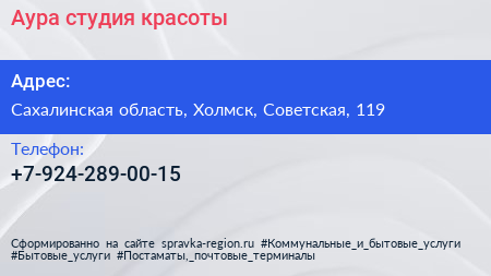 Аура, студия красоты по адресу Сахалинская область, Холмск, Советская, 119 в дальнейшем Организация, размещена в следующих категориях: