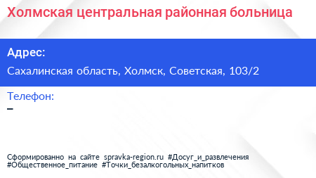 Холмская центральная районная больница по адресу Сахалинская область, Холмск, Советская, 103/2 в дальнейшем Организация, размещена в следующих категориях: